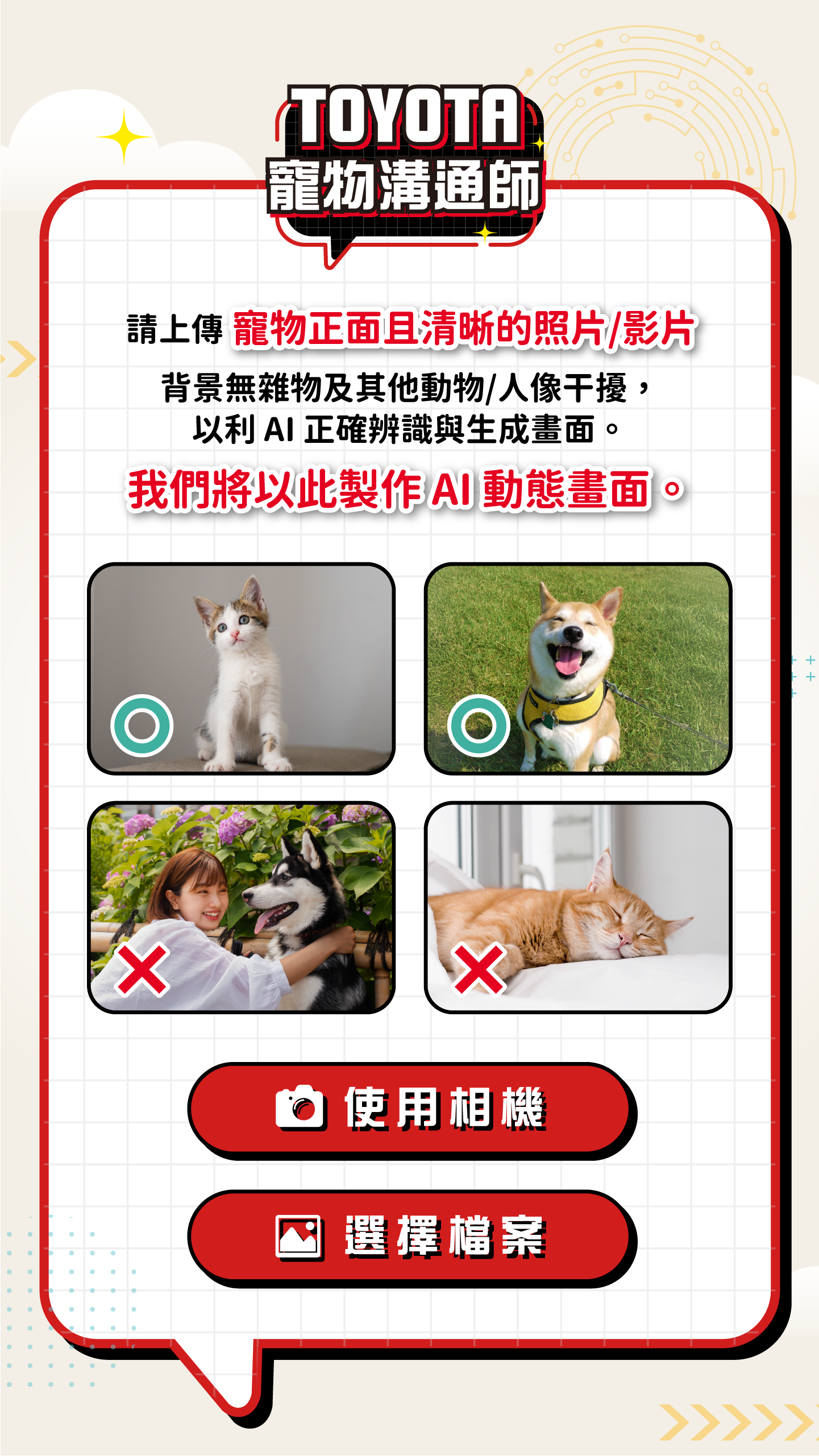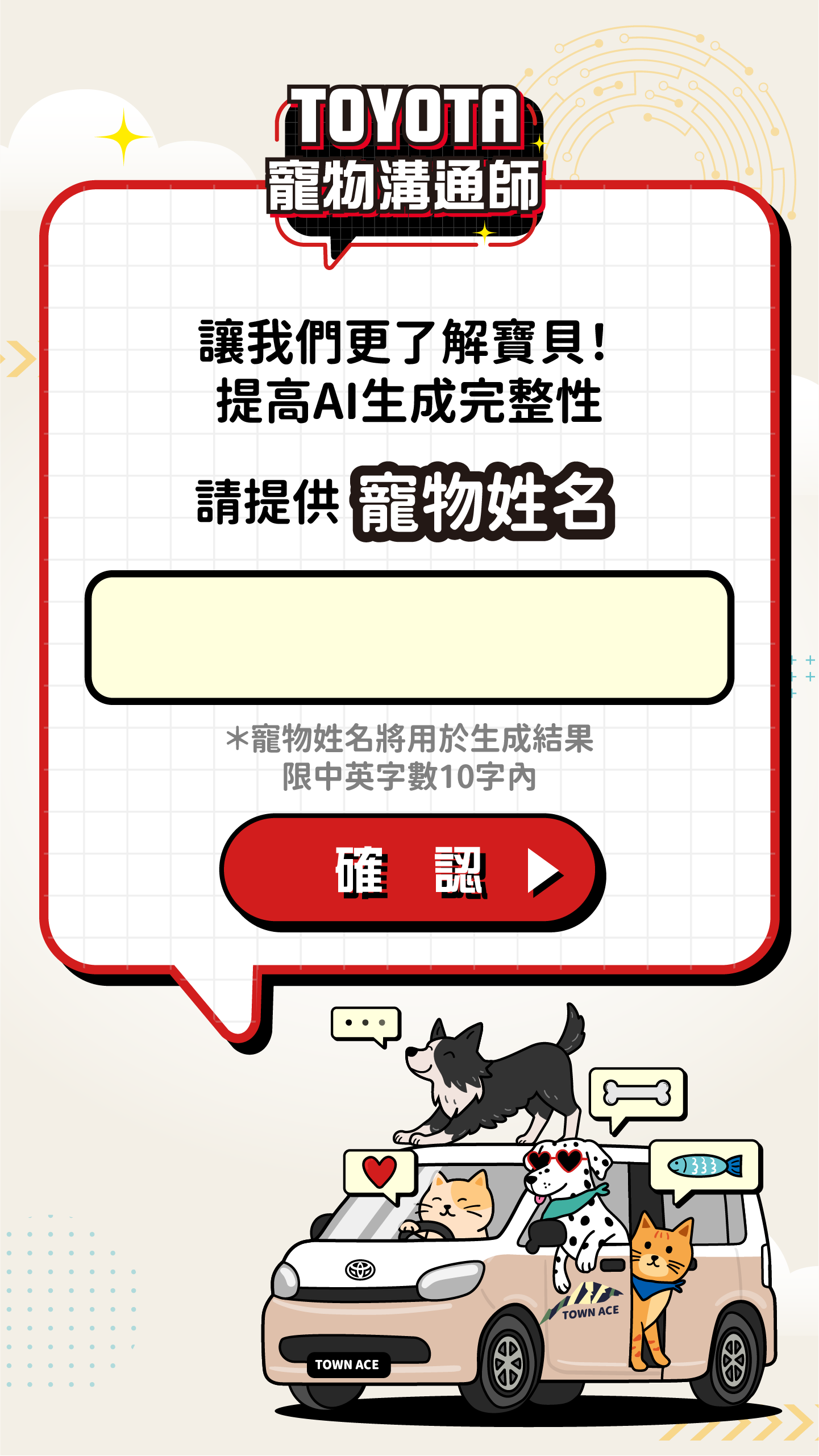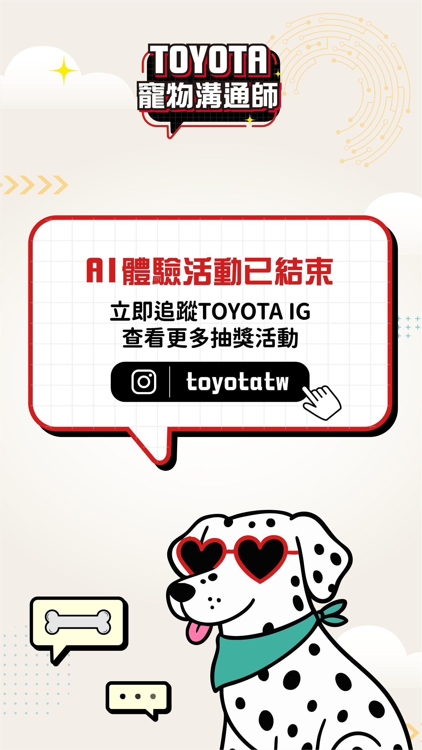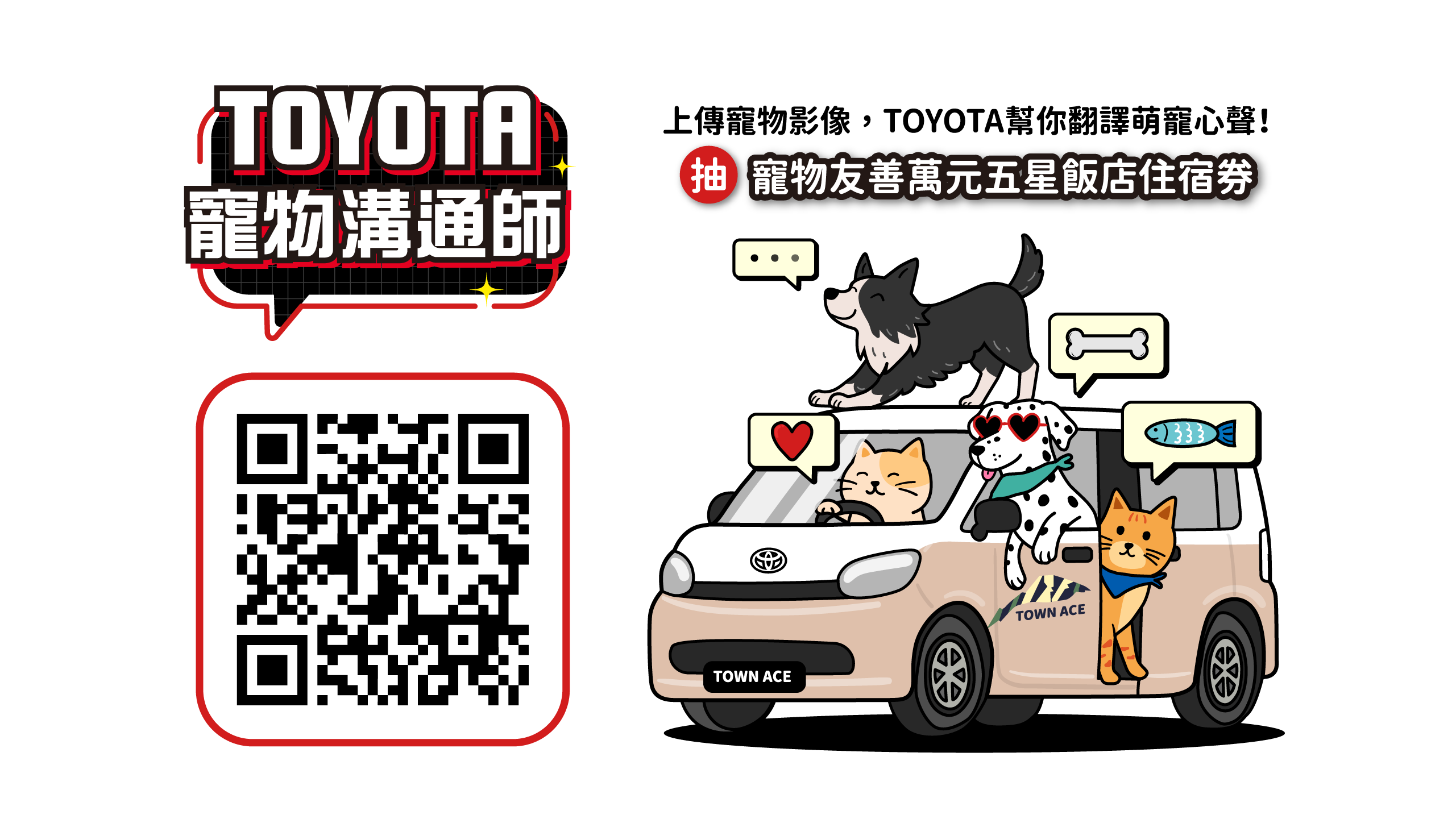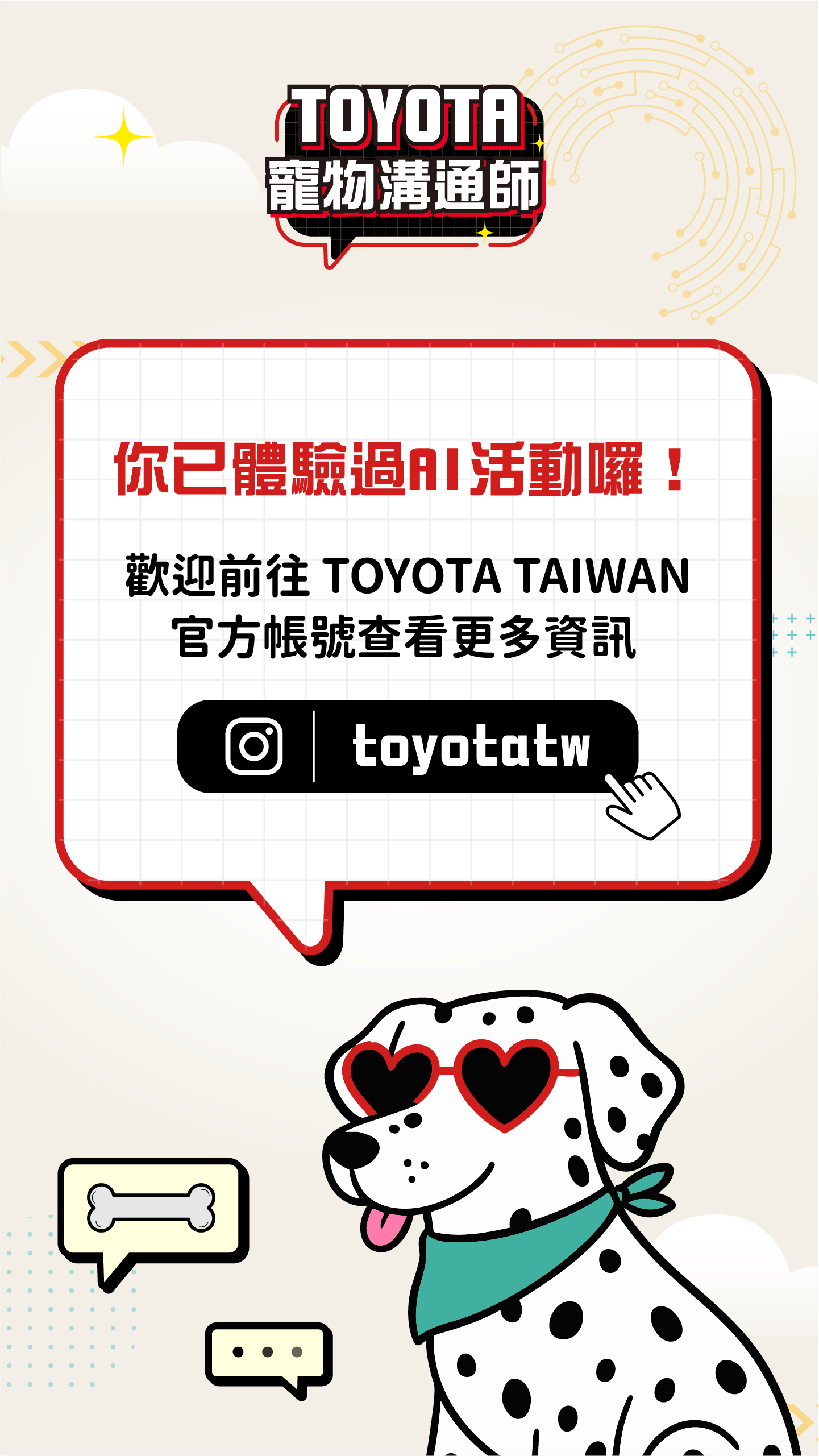 TOYOTA 寵物溝通師・幫你翻譯萌寵心聲・想知道你家毛小孩心裡在想什麼?上傳寵物照片或影片,AI 即刻生成並翻譯他的可愛心聲。分享成果到 IG,有機會抽中【寵物友善五星級住宿券】!