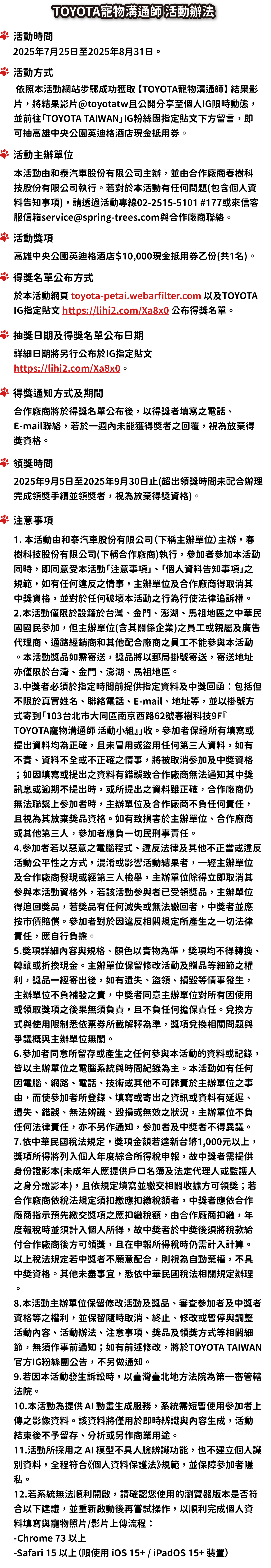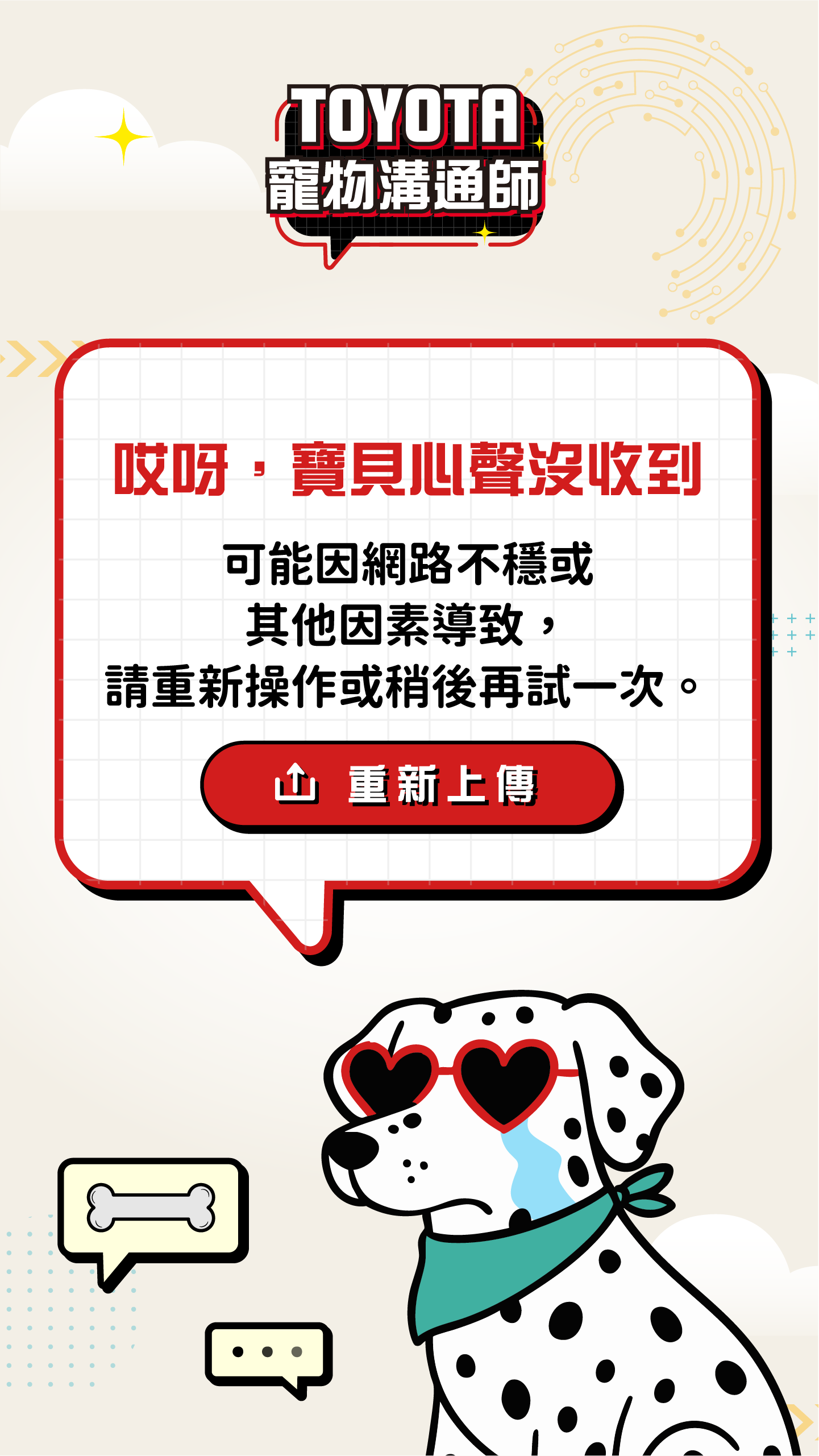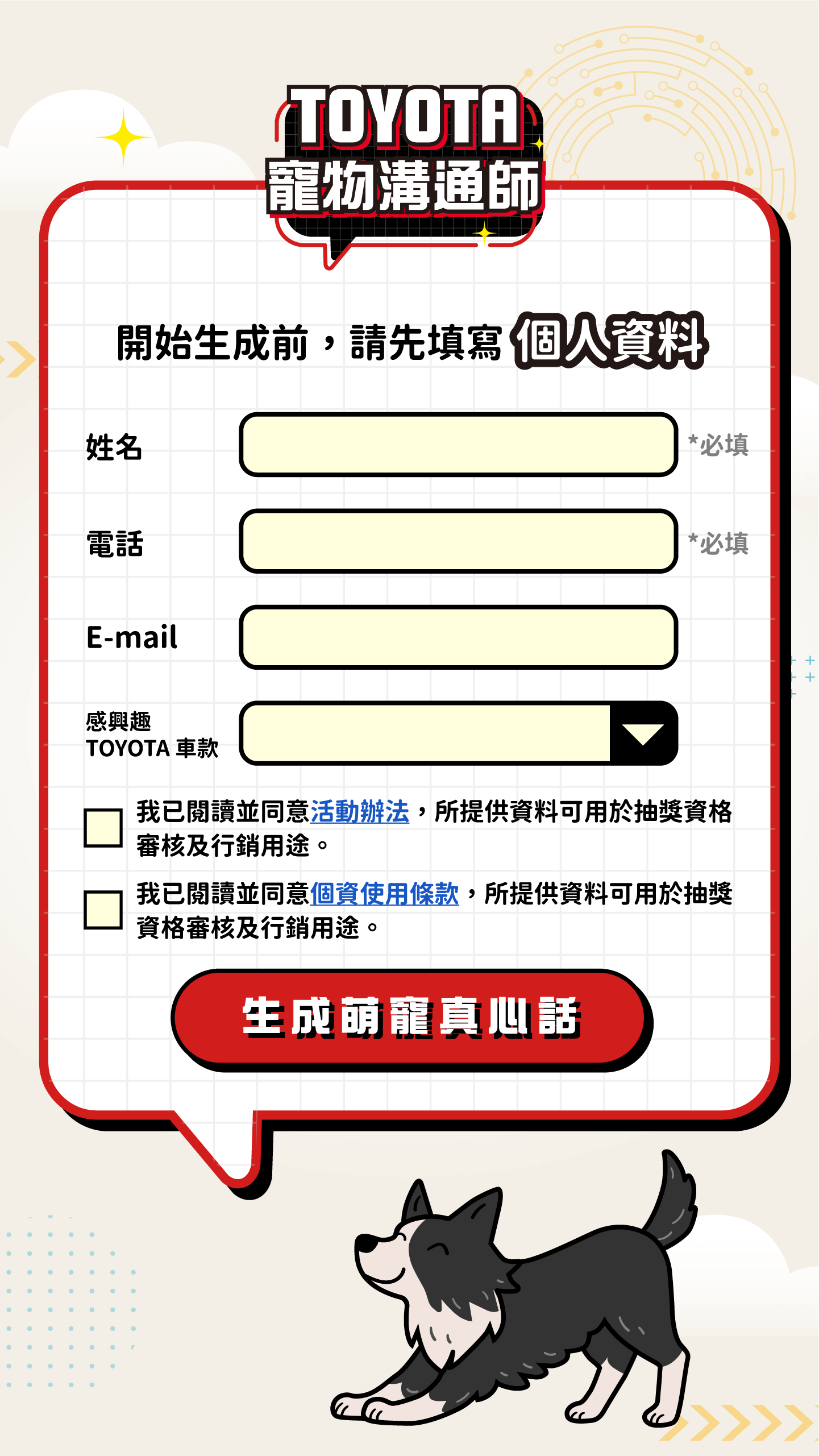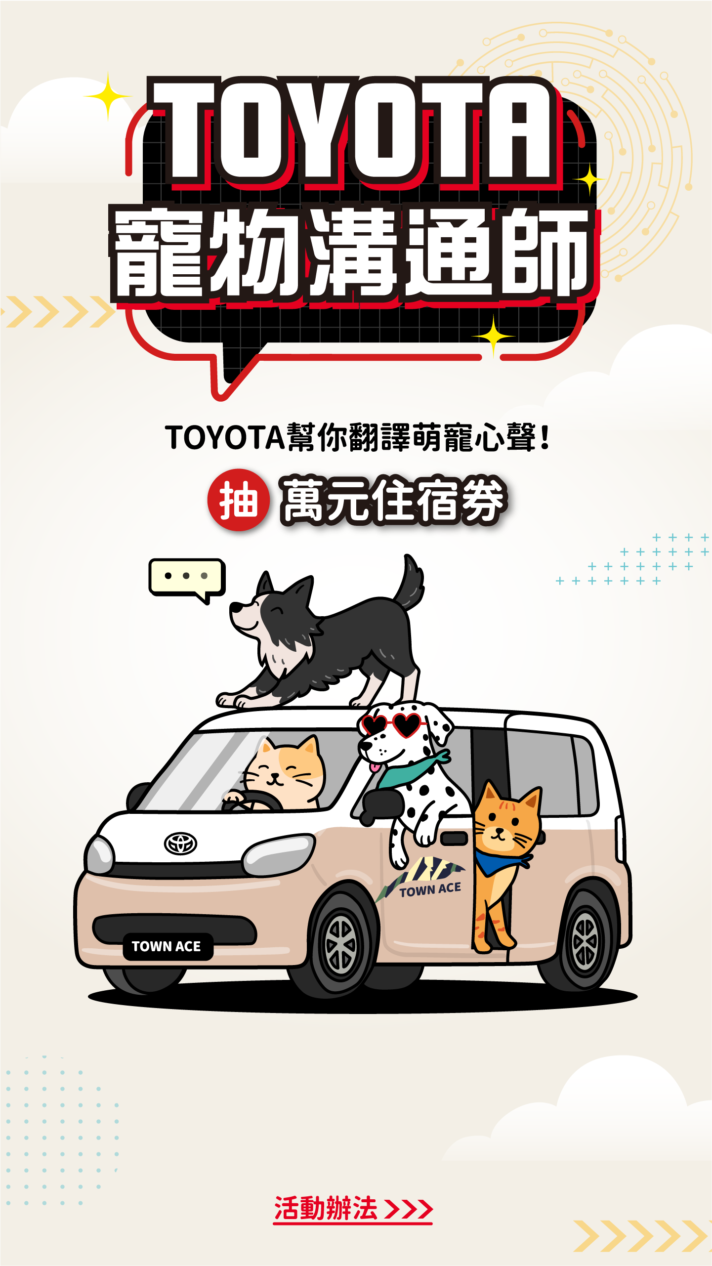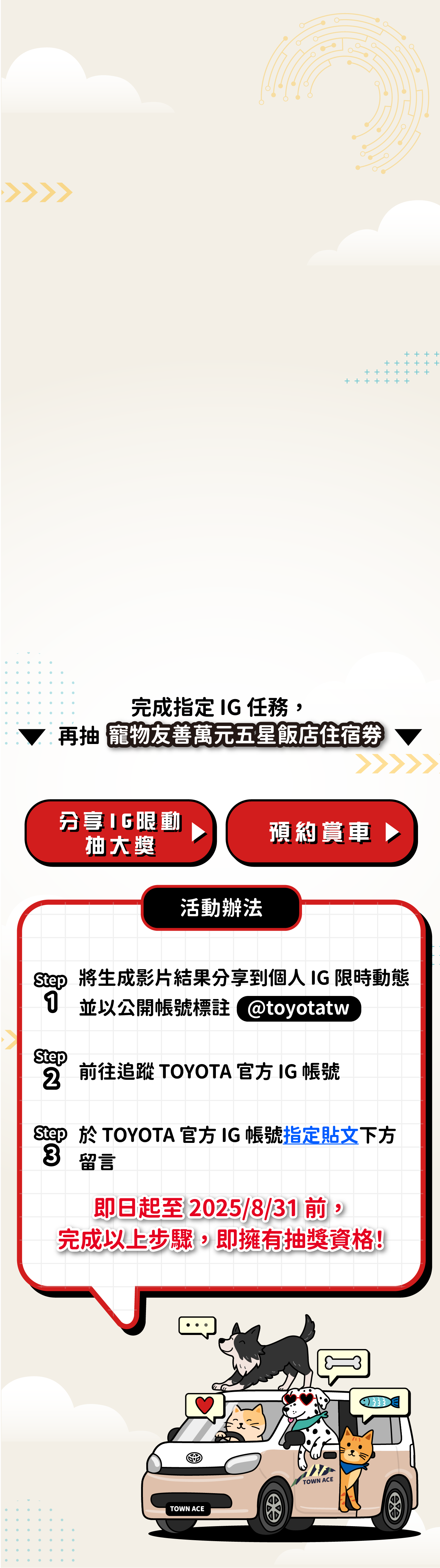 TOYOTA 寵物溝通師・幫你翻譯萌寵心聲・想知道你家毛小孩心裡在想什麼?上傳寵物照片或影片,AI 即刻生成並翻譯他的可愛心聲。分享成果到 IG,有機會抽中【寵物友善五星級住宿券】!